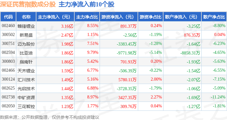 资金流向方面,深证民营(399337)指数成份股当日主力资金净流出合计71.13亿元,游资资金净流入合计15.68亿元,散户资金净流入合计55.46亿元。成份股资金流向详情见下表: