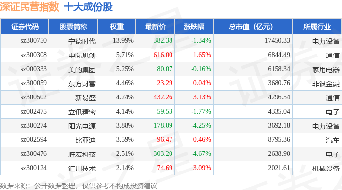 证券之星消息,12月10日,深证民营(399337)指数报收于6631.82点,跌0.04%,成交2080.47亿元,换手率1.45%。当日该指数成份股中,上涨的有59家,新诺威以8.39%的涨幅领涨,下跌的有39家,胜宏科技以4.67%的跌幅领跌。