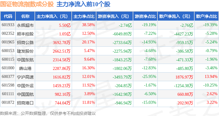 资金流向方面,国证物流(399353)指数成份股当日主力资金净流入合计4.43亿元,游资资金净流出合计5.05亿元,散户资金净流入合计6229.5万元。成份股资金流向详情见下表: