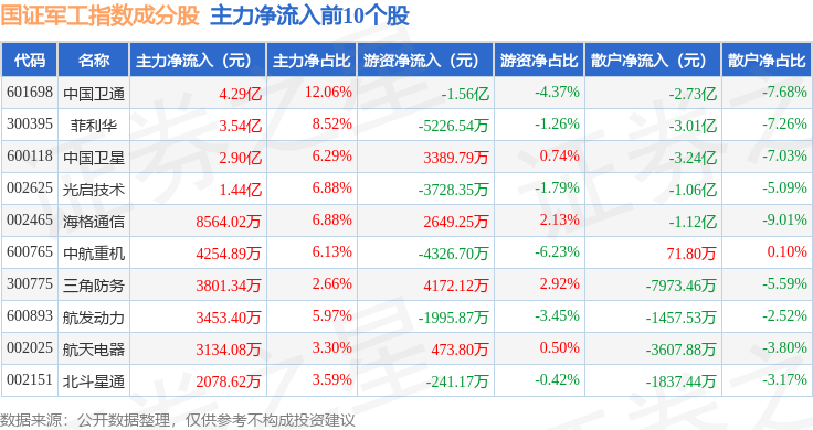 资金流向方面,国证军工(399368)指数成份股当日主力资金净流入合计7.9亿元,游资资金净流出合计2.4亿元,散户资金净流出合计5.5亿元。成份股资金流向详情见下表: