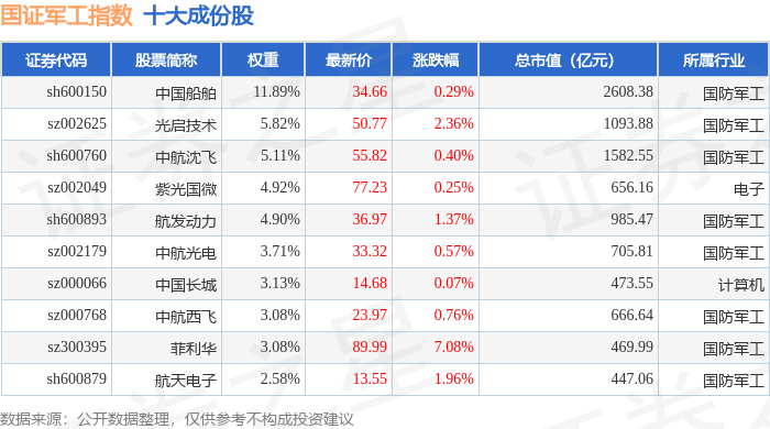 国证军工(399368)指数十大成份股详情如下:
