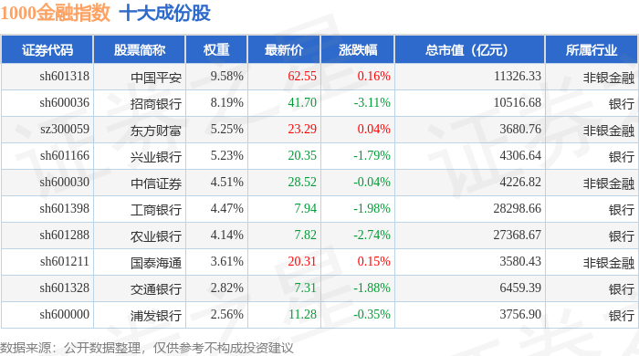 证券之星消息,12月10日,1000金融(399387)指数报收于5542.97点,跌0.71%,成交657.14亿元,换手率0.39%。当日该指数成份股中,上涨的有55家,中银证券以2.55%的涨幅领涨,下跌的有38家,招商银行以3.11%的跌幅领跌。