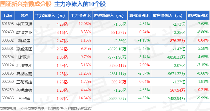 资金流向方面,国证新兴(399392)指数成份股当日主力资金净流出合计105.36亿元,游资资金净流入合计28.17亿元,散户资金净流入合计77.19亿元。成份股资金流向详情见下表: