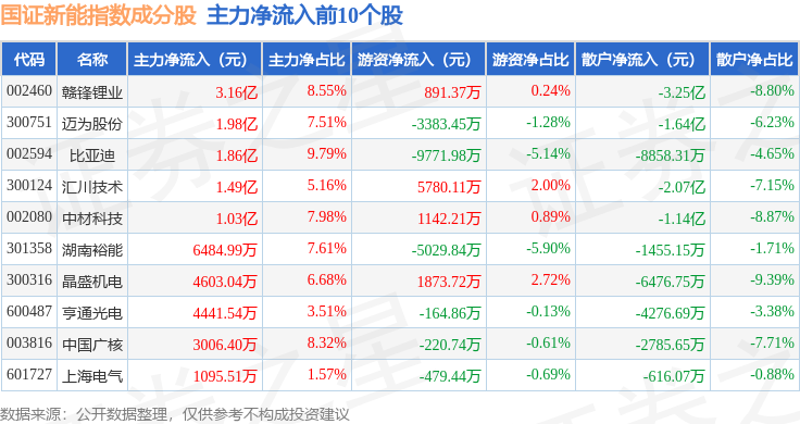 资金流向方面,国证新能(399412)指数成份股当日主力资金净流出合计31.41亿元,游资资金净流入合计9.09亿元,散户资金净流入合计22.33亿元。成份股资金流向详情见下表: