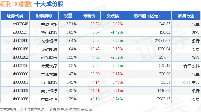 证券之星消息,12月10日,红利100(399411)指数报收于3467.52点,涨0.11%,成交410.99亿元,换手率0.34%。当日该指数成份股中,上涨的有50家,宁波华翔以6.92%的涨幅领涨,下跌的有45家,亚太科技以3.07%的跌幅领跌。