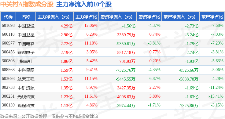 资金流向方面,中关村A(399422)指数成份股当日主力资金净流出合计9.4亿元,游资资金净流入合计6.26亿元,散户资金净流入合计3.03亿元。成份股资金流向详情见下表: