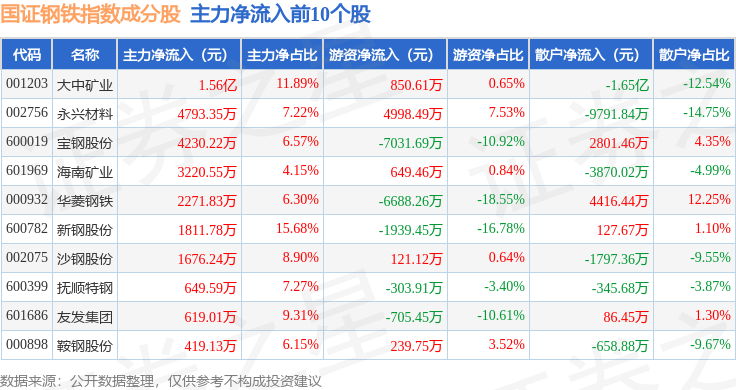 资金流向方面,国证钢铁(399440)指数成份股当日主力资金净流入合计2344.06万元,游资资金净流出合计6096.74万元,散户资金净流入合计3752.68万元。成份股资金流向详情见下表: