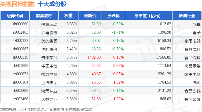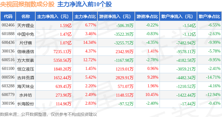 资金流向方面,央视回报(399553)指数成份股当日主力资金净流出合计6.9亿元,游资资金净流入合计1.61亿元,散户资金净流入合计5.29亿元。成份股资金流向详情见下表: