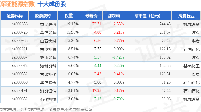证券之星消息,12月10日,深证能源(399613)指数报收于3336.34点,涨0.71%,成交29.37亿元,换手率1.03%。当日该指数成份股中,上涨的有6家,杰瑞股份以2.55%的涨幅领涨,下跌的有5家,冀中能源以1.42%的跌幅领跌。