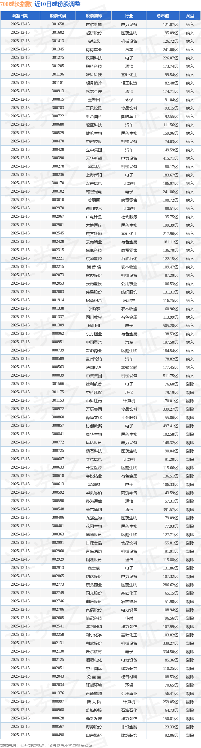 近10日内700成长(399628)指数成份股做了调整,新纳入了43只股票,剔除了43只股票。
