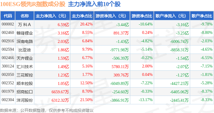 资金流向方面,100ESG领先R(470030)指数成份股当日主力资金净流出合计33.14亿元,游资资金净流入合计6.81亿元,散户资金净流入合计26.33亿元。成份股资金流向详情见下表: