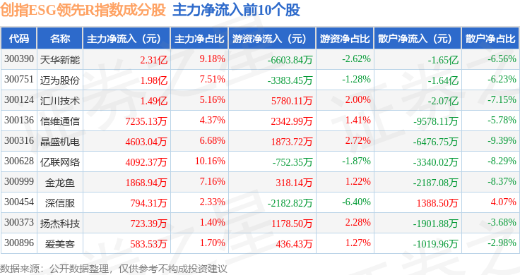 资金流向方面,创指ESG领先R(470031)指数成份股当日主力资金净流出合计41.8亿元,游资资金净流入合计15.73亿元,散户资金净流入合计26.06亿元。成份股资金流向详情见下表: