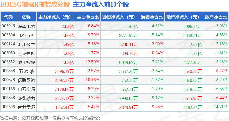 资金流向方面,100ESG增强R(470033)指数成份股当日主力资金净流出合计39.83亿元,游资资金净流入合计9.43亿元,散户资金净流入合计30.4亿元。成份股资金流向详情见下表: