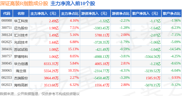 资金流向方面,深证高装R(470037)指数成份股当日主力资金净流出合计2.03亿元,游资资金净流出合计2.83亿元,散户资金净流入合计4.86亿元。成份股资金流向详情见下表: