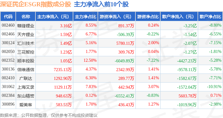 资金流向方面,深证民企ESGR(470056)指数成份股当日主力资金净流出合计39.75亿元,游资资金净流入合计10.43亿元,散户资金净流入合计29.31亿元。成份股资金流向详情见下表:
