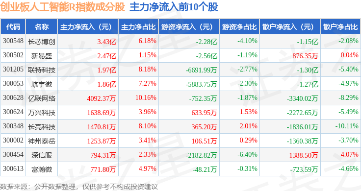 资金流向方面,创业板人工智能R(470070)指数成份股当日主力资金净流出合计25.63亿元,游资资金净流出合计8441.92万元,散户资金净流入合计26.47亿元。成份股资金流向详情见下表: