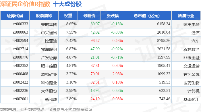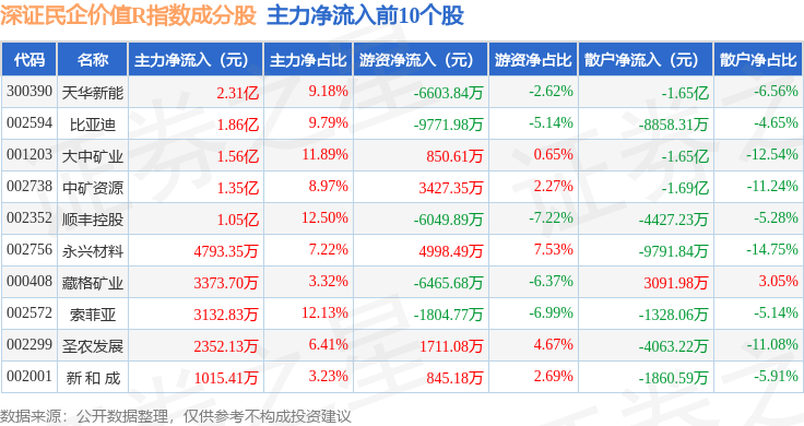 资金流向方面,深证民企价值R(470072)指数成份股当日主力资金净流出合计6.5亿元,游资资金净流入合计3960.22万元,散户资金净流入合计6.1亿元。成份股资金流向详情见下表: