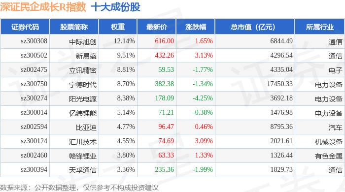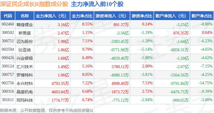 资金流向方面,深证民企成长R(470071)指数成份股当日主力资金净流出合计38.93亿元,游资资金净流入合计7.56亿元,散户资金净流入合计31.37亿元。成份股资金流向详情见下表: