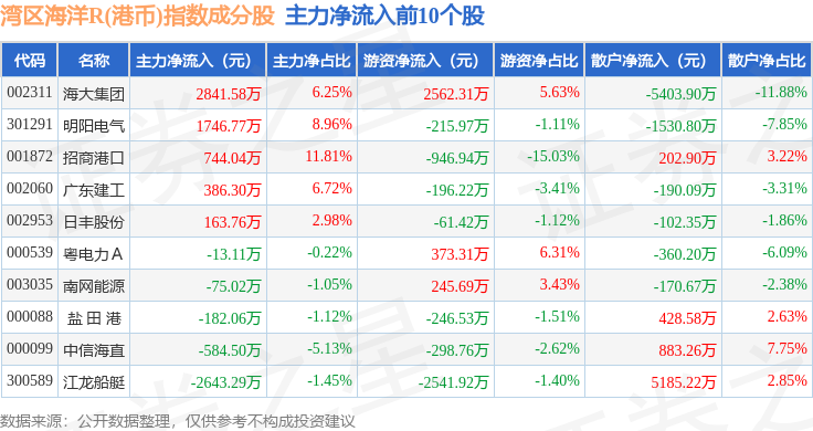 资金流向方面,湾区海洋R(港币)(480020)指数成份股当日主力资金净流出合计1.31亿元,游资资金净流入合计1534.9万元,散户资金净流入合计1.16亿元。成份股资金流向详情见下表: