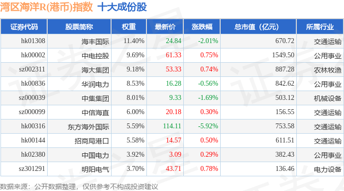 湾区海洋R(港币)(480020)指数十大成份股详情如下: