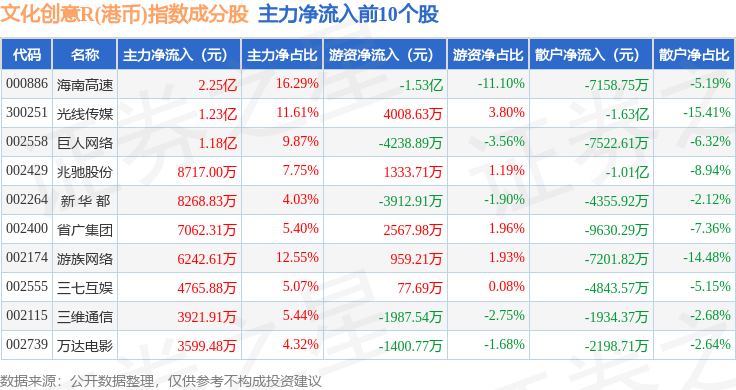 资金流向方面,文化创意R(港币)(480047)指数成份股当日主力资金净流出合计4.87亿元,游资资金净流入合计9663.34万元,散户资金净流入合计3.91亿元。成份股资金流向详情见下表: