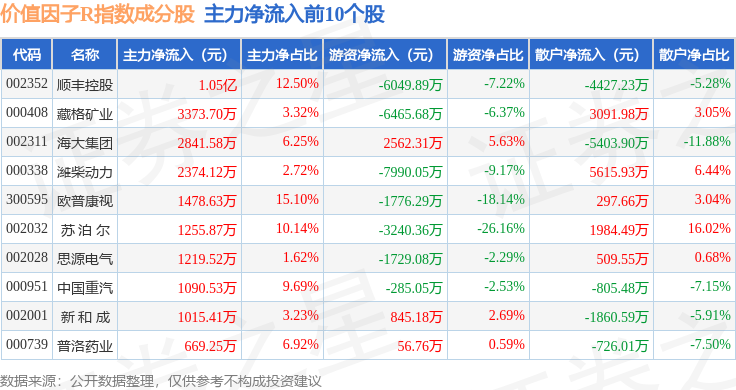 资金流向方面,价值因子R(480056)指数成份股当日主力资金净流出合计15.07亿元,游资资金净流出合计1263.57万元,散户资金净流入合计15.19亿元。成份股资金流向详情见下表: