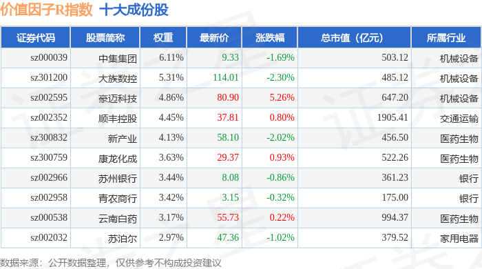 证券之星消息,12月10日,价值因子R(480056)指数报收于3179.9点,涨0.11%,成交284.23亿元,换手率0.84%。当日该指数成份股中,上涨的有29家,豪迈科技以5.26%的涨幅领涨,下跌的有21家,上能电气以4.41%的跌幅领跌。