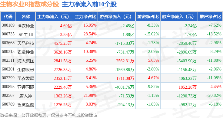 资金流向方面,生物农业R(480072)指数成份股当日主力资金净流入合计3.64亿元,游资资金净流出合计2.15亿元,散户资金净流出合计1.37亿元。成份股资金流向详情见下表: