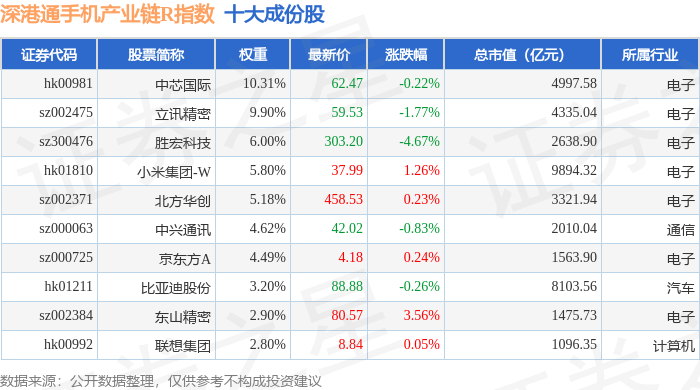 深港通手机产业链R(483009)指数十大成份股详情如下: