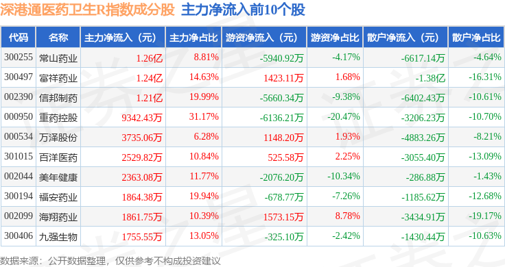 资金流向方面,深港通医药卫生R(483023)指数成份股当日主力资金净流出合计7.42亿元,游资资金净流入合计5725.22万元,散户资金净流入合计6.85亿元。成份股资金流向详情见下表: