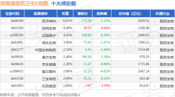 深港通医药卫生R(483023)指数十大成份股详情如下: