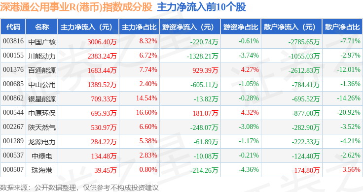 资金流向方面,深港通公用事业R(港币)(483032)指数成份股当日主力资金净流出合计2.05亿元,游资资金净流入合计1641.66万元,散户资金净流入合计1.89亿元。成份股资金流向详情见下表: