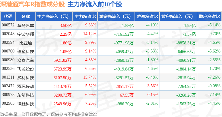 资金流向方面,深港通汽车R(483039)指数成份股当日主力资金净流入合计8270.46万元,游资资金净流出合计4.47亿元,散户资金净流入合计3.64亿元。成份股资金流向详情见下表: