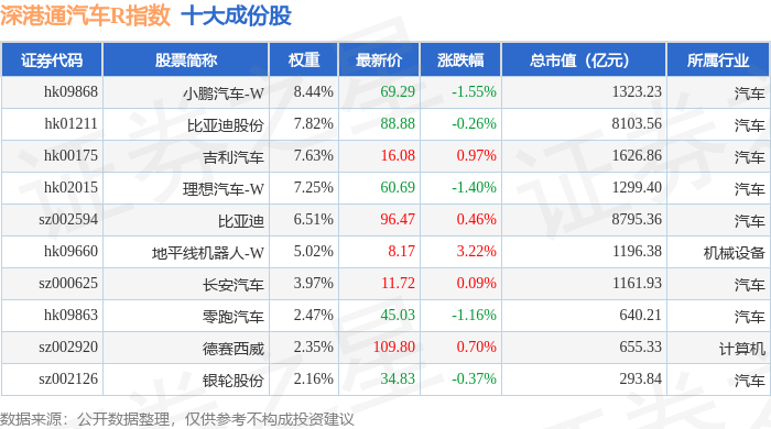 证券之星消息,12月10日,深港通汽车R(483039)指数报收于9272.14点,涨0.26%,成交371.01亿元,换手率2.07%。当日该指数成份股中,上涨的有56家,海马汽车以10.0%的涨幅领涨,下跌的有38家,航天科技以4.35%的跌幅领跌。