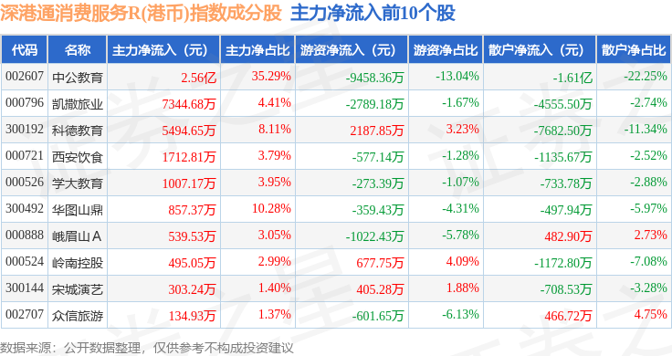 资金流向方面,深港通消费服务R(港币)(483046)指数成份股当日主力资金净流入合计3.55亿元,游资资金净流出合计1.3亿元,散户资金净流出合计2.25亿元。成份股资金流向详情见下表:
