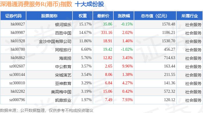 深港通消费服务R(港币)(483046)指数十大成份股详情如下: