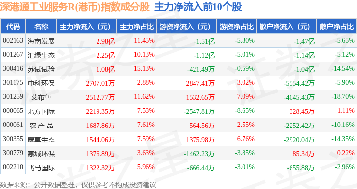 资金流向方面,深港通工业服务R(港币)(483056)指数成份股当日主力资金净流入合计4947.17万元,游资资金净流出合计5526.82万元,散户资金净流入合计579.65万元。成份股资金流向详情见下表:
