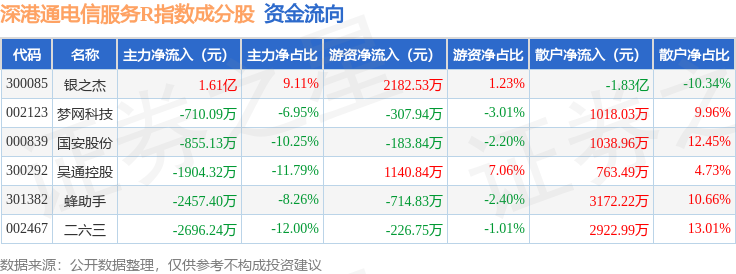 资金流向方面,深港通电信服务R(483057)指数成份股当日主力资金净流入合计7525.89万元,游资资金净流入合计1890.01万元,散户资金净流出合计9415.91万元。成份股资金流向详情见下表: