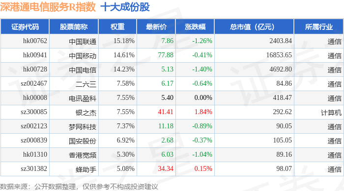 深港通电信服务R(483057)指数十大成份股详情如下: