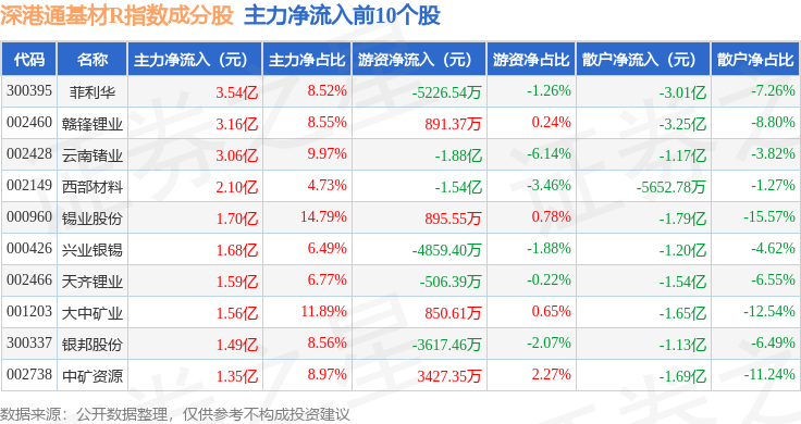 资金流向方面,深港通基材R(483061)指数成份股当日主力资金净流入合计13.71亿元,游资资金净流出合计6580.03万元,散户资金净流出合计13.05亿元。成份股资金流向详情见下表: