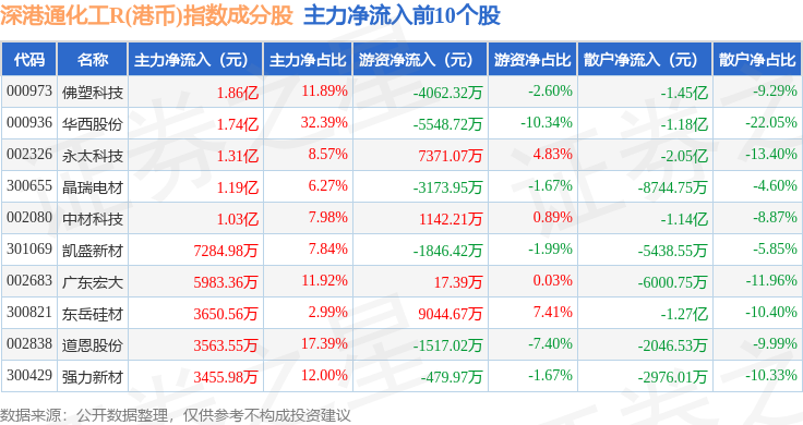 资金流向方面,深港通化工R(港币)(483064)指数成份股当日主力资金净流入合计3.05亿元,游资资金净流出合计5957.18万元,散户资金净流出合计2.46亿元。成份股资金流向详情见下表: