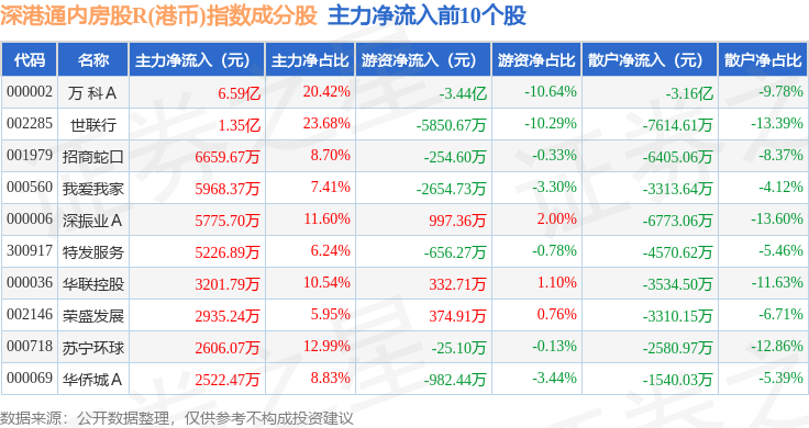 资金流向方面,深港通内房股R(港币)(483084)指数成份股当日主力资金净流入合计11.25亿元,游资资金净流出合计3.8亿元,散户资金净流出合计7.45亿元。成份股资金流向详情见下表: