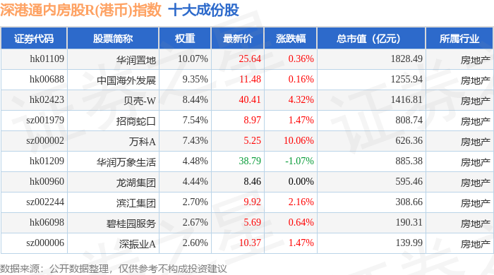 深港通内房股R(港币)(483084)指数十大成份股详情如下: