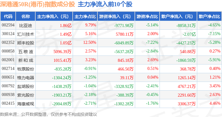 资金流向方面,深港通50R(港币)(483092)指数成份股当日主力资金净流出合计36.67亿元,游资资金净流入合计9.84亿元,散户资金净流入合计26.83亿元。成份股资金流向详情见下表: