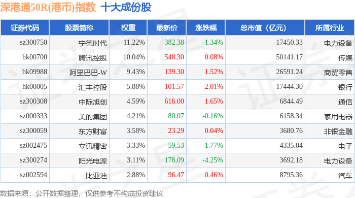 深港通50R(港币)(483092)指数十大成份股详情如下: