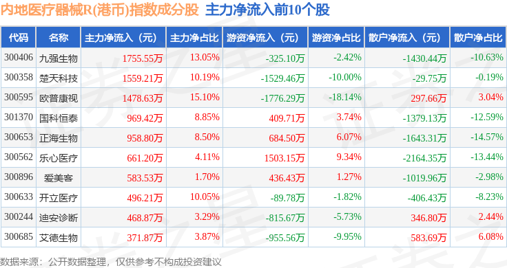资金流向方面,内地医疗器械R(港币)(483104)指数成份股当日主力资金净流出合计2.5亿元,游资资金净流入合计3923.26万元,散户资金净流入合计2.1亿元。成份股资金流向详情见下表: