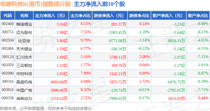 资金流向方面,低碳科技R(港币)(483161)指数成份股当日主力资金净流出合计23.37亿元,游资资金净流入合计5.37亿元,散户资金净流入合计18.0亿元。成份股资金流向详情见下表: