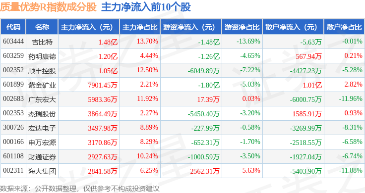 资金流向方面,质量优势R(489017)指数成份股当日主力资金净流出合计7.36亿元,游资资金净流出合计9433.93万元,散户资金净流入合计8.3亿元。成份股资金流向详情见下表: