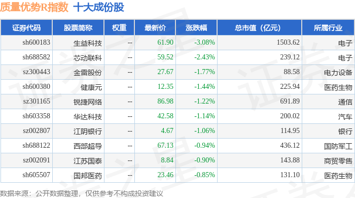 证券之星消息,12月10日,质量优势R(489017)指数报收于12221.85点,涨0.57%,成交421.39亿元,换手率0.64%。当日该指数成份股中,上涨的有65家,喜临门以5.63%的涨幅领涨,下跌的有29家,生益科技以3.08%的跌幅领跌。