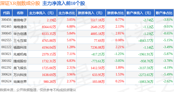 资金流向方面,深证XR(970046)指数成份股当日主力资金净流出合计20.6亿元,游资资金净流入合计8.61亿元,散户资金净流入合计12.0亿元。成份股资金流向详情见下表: